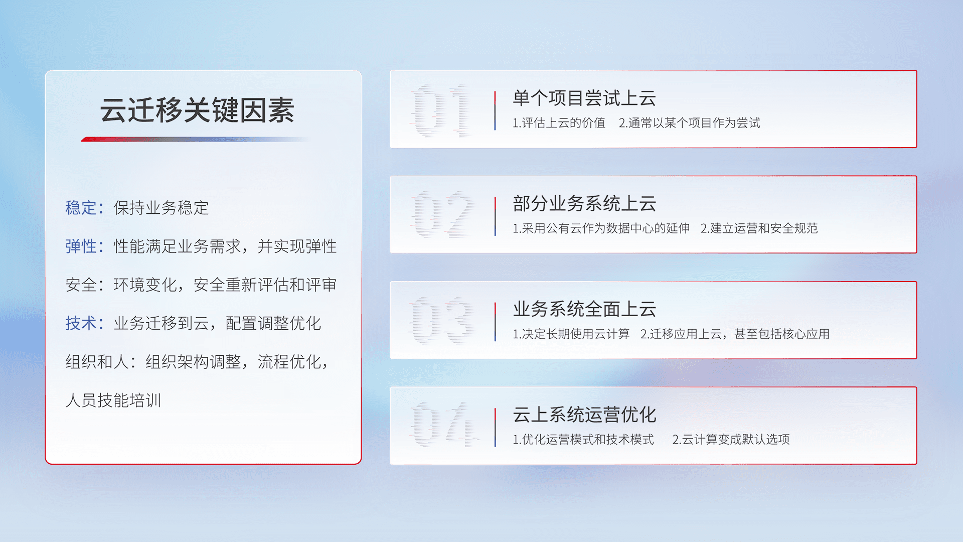 结合实际业务,,从规划设计、、、、云平台选型、、云原生改造、、数据迁移、、、、集成交付,,,迁移全过程为客户识别最佳上云路径,,做好风险识别管理,,,,设计网络架构、、、、身份权限、、、安全审计合规、、、、操作审计、、、、日志审计、、、监控告警策略、、、、多站点容灾设计等,,,,对云上基础设施进行整体规划,,,,提升IT治理水平,,,以满足弹性、、高可用、、、高性能的需求。。。。