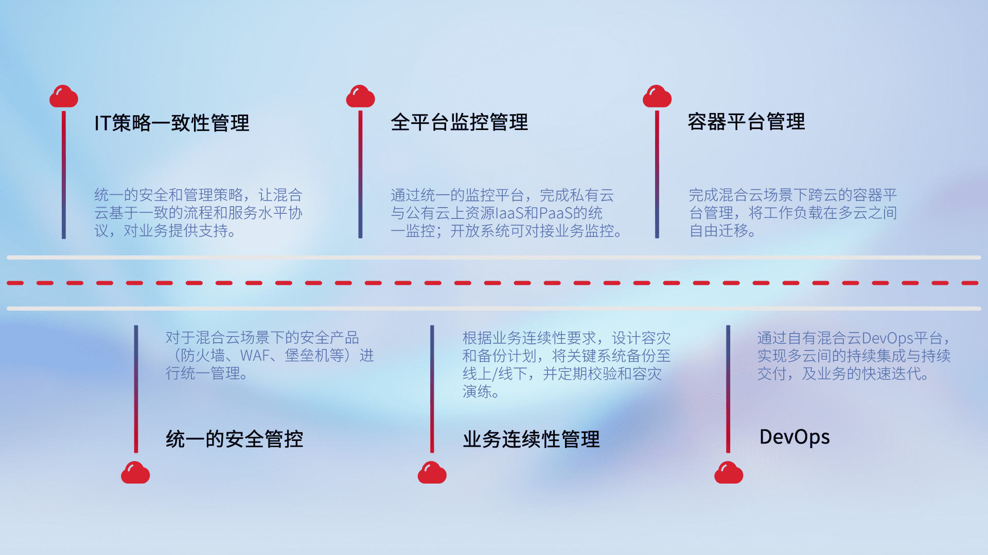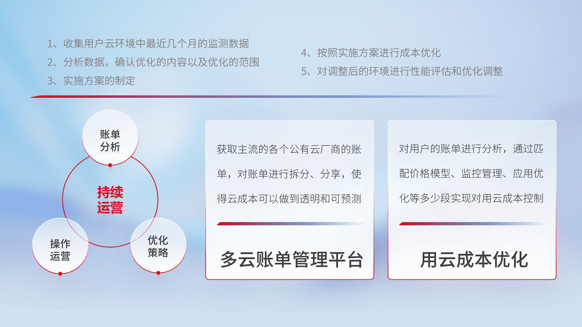 通过多云纳管,,,,以统一的资源数据模型把客户的云资源进行抽象和封装,,,,进而实现对多云资源的统一操作,,保障云资源管理的可靠性、、、稳定性与可用性。。。。量身定制化运维内容,,,配置、、开发运维、、、补丁管理、、、、备份、、、监控、、认证和访问管理、、、、审计和日常巡检等,,保障在用云过程中的可靠度,,稳定度以及高可用率。。。